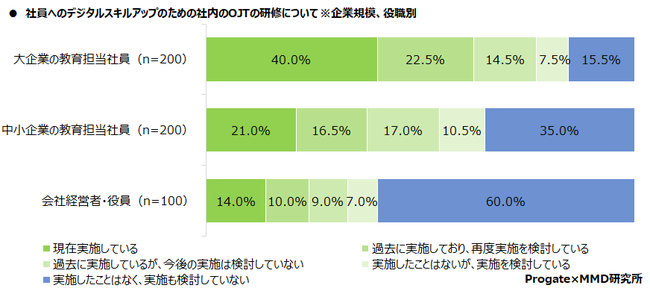 社内のOJTで「現在実施している」回答は、大企業の教育担当社員(n=200)が40.0%、中小企業の教育担当社員(n=200)が21.0%、会社経営者・役員(n=100)が14.0%となり、大企業と中小企業の差は19.0ポイントとなった。