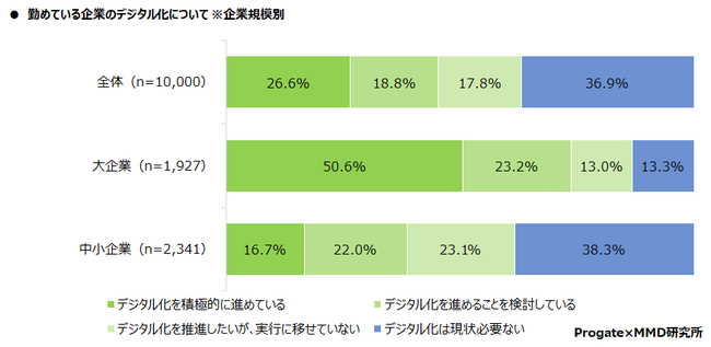 企業規模別で見ると、大企業(n=1,927)は86.7%、中小企業(n=2,341)は61.7%が企業のデジタル化の推進を考えていると回答した。