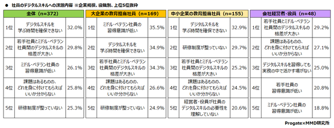 大企業の課題内容は「ミドル・ベテラン社員の習得意識が低い」がトップ。72.6%の企業がデジタルスキル研修を実施・検討している。
