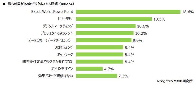 勤めている企業で社員へのデジタルスキルアップのための研修を実施したことがある342人を対象に、具体的なデジタルスキル名を9つあげて研修を実施したことがあるか聞いたところ、80.1%が実施したことがあると回答した。次に、具体的なデジタルスキル9つの研修を実施したことがある274人を対象に、最も効果があったデジタルスキル研修を聞いたところ、「Excel、Word、PowerPoint」が18.6%、「セキュリティ」が13.5%、「デジタルマーケティング」は10.6%となった。