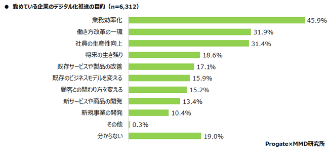 企業のデジタル化の推進を考えている6,312人を対象に、勤めている企業のデジタル化の推進の目的を複数回答で聞いたところ、「業務効率化」が45.9%と最も多く、次に「働き方改革の一環」が31.9%、「社員の生産性向上」が31.4%となった。