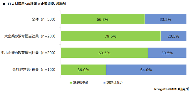 予備調査から社員・部下教育、福利厚生を担当している社員または会社経営者・役員500人を抽出し、IT人材採用への課題があるか聞いたところ、「課題がある」と回答したのは大企業の教育担当社員(n=200)が79.5%、中小企業の教育担当社員(n=200)が69.5%、会社経営者・役員(n=100)が36.0%となった。