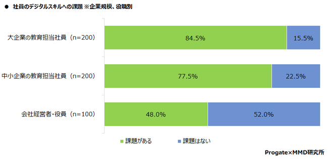 社員・部下教育、福利厚生を担当している社員または会社経営者・役員500人を対象に、社員のデジタルスキルへの課題があるか聞いたところ、「課題がある」と回答したのは大企業の教育担当社員(n=200)が84.5%、中小企業の教育担当社員(n=200)が77.5%、会社経営者・役員(n=100)が48.0%となった。