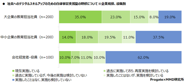各研修方法を企業規模、社員別で見ると、自律学習支援型で「現在実施している」回答は、大企業の教育担当社員(n=200)が35.0%、中小企業の教育担当社員(n=200)が14.0%、会社経営者・役員(n=100)が10.0%となり、大企業と中小企業の差は21.0ポイントとなった。