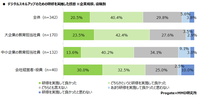企業規模、役職別で見ると、実施して良かったと回答したのは大企業の教育担当社員(n=170)が65.9%、中小企業の教育担当社員(n=132)が53.8%、会社経営者・役員(n=40)が62.5%となった。