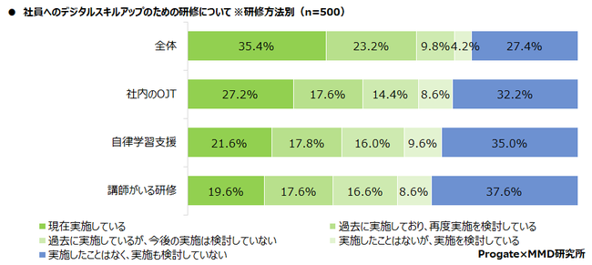 社員・部下教育、福利厚生を担当している社員または会社経営者・役員500人を対象に、勤めている企業で社員へのデジタルスキルアップのための研修について聞いたところ、「現在実施している」が35.4%となった。「過去に実施しており、再度実施を検討している」が23.2%、「実施したことはないが、実施を検討している」が4.2%と合わせて27.4%が検討していると回答した。