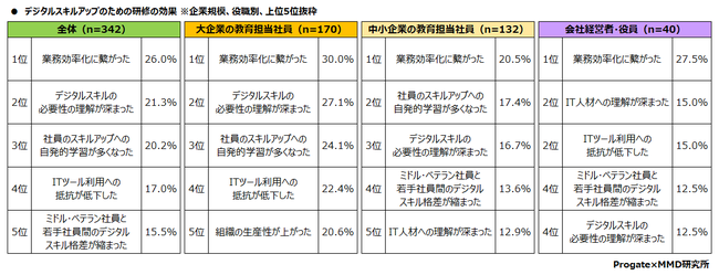 続いて、デジタルスキル研修の効果を複数回答で聞いたところ、「業務効率化に繋がった」が26.0%と最も多く、次に「デジタルスキルの必要性の理解が深まった」が21.3%、「社員のスキルアップへの自発的学習が多くなった」が20.2%となり、企業規模、役職別でも「業務効率化に繋がった」がそれぞれトップとなった。