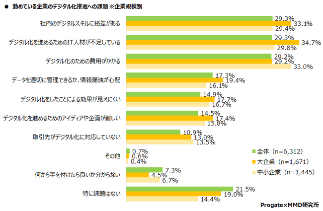 次に、企業のデジタル化の推進を考えている6,312人を対象に、デジタル化の推進への課題を複数回答で聞いたところ、「社内のデジタルスキルに格差がある」と「デジタル化を進めるためのIT人材が不足している」が29.3%と最も多く、次に「デジタル化のための費用がかかる」が29.2%、「データを適切に管理できるか、情報漏洩が心配」が17.3%となった。企業規模別で見ると、大企業(n=1,671)は「デジタル化を進めるためのIT人材が不足している」が34.7%、中小企業(n=1,445)は「デジタル化のための費用がかかる」が33.0%とそれぞれトップとなった。