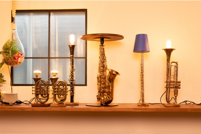 島村楽器のお客様より回収した廃棄楽器や耐用年数を過ぎた部品、また近隣の小・中・高等学校などからの依頼により引き取った廃棄楽器たちに、もう一度命を吹き込み、インテリアなど新たな形で活躍の機会を与える取り組み「楽器アップサイクルプロジェクト」。スタンドライト、サイドテーブルなどに生まれ変わった楽器インテリアを展示いたします。