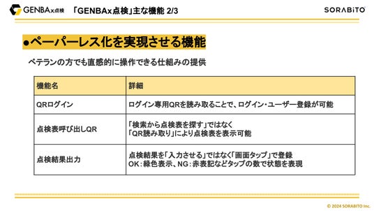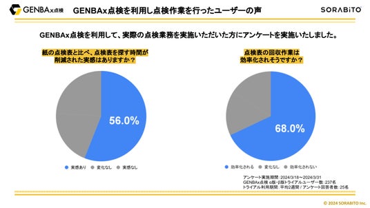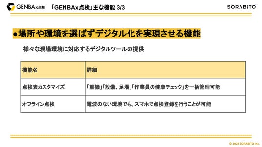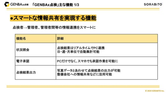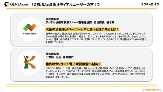 SORABITO株式会社(代表取締役:博多一晃、本社:東京都中央区、以下「SORABITO」)は、建設現場における安全点検の管理業務を効率化する新サービス「GENBAx点検」をこの度正式にリリースすることをお知らせいたします。2023年12月のブランド発表以降、多くの建設会社様に実際の建設現場で本サービスのトライアル版をご利用をいただき、ユーザーからの声を大いに生かしつつ開発を進めて参りました。SORABITOは、本サービスを通じ建設現場の安全性及び生産性の向上に貢献するとともに、建設業において喫緊の課題となっている所謂「2024年問題」の解決にも寄与して参ります。