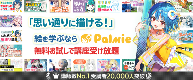 パルミーは、自宅に居ながらイラストやマンガの描き方が学べるオンライン教室です。著名クリエイターや漫画家、アニメーター、専門学校講師など、多くの「プロ」が講師を務めています。月額定額制(サブスク)で授業が受けられる「月謝制」は、累計利用者数20,000名を突破し、順調に利用者数を増やしています。