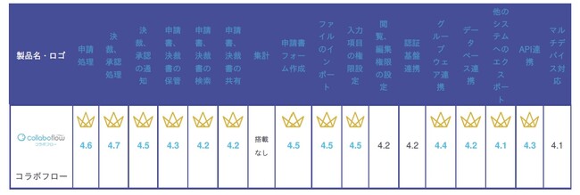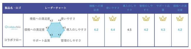 ・“ユーザービリティの良さ”を算出した「ユーザービリティスコア」(「使いやすさ」「サポート品質」「機能への満足度」の各スコアの合計値)で、コラボフローがトップスコアを獲得。