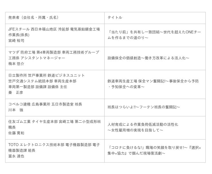 今回は、2日間で12社12名のみなさまに日ごろの取り組みを発表いただきました。国内各地の工場現地スタッフやマネージャーなど、ものづくり人材が集結した中での開催となりました。