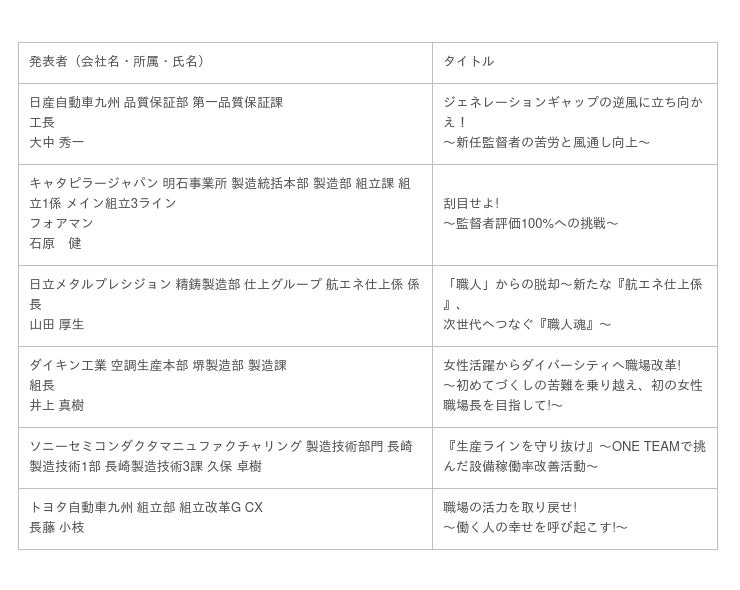 この催しは、第一線監督者による活動事例発表を行い、具体的な改善活動の内容・成果に加え、発表者自身が、第一線監督者としてどのような役割を担い行動し、職場をマネジメントしたかについて発表するものです。参加されたみなさまには現場マネジメントの事例として、また、現場教育の参考事例としてご活用いただいております。