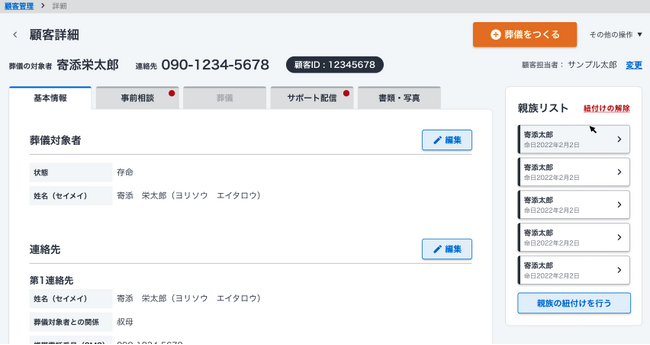 喪主さまの基本情報はもちろんのこと、事前の相談内容、お葬式の内容、サポート配信内容、顧客ごとの書類やお葬式時の写真などを登録可能です。よりそうクラウド訃報案内とあわせて利用いただくことで、訃報案内を作成したときに登録した情報が、自動でよりそうクラウドの顧客情報として登録され、よりそうクラウドの顧客管理機能から閲覧可能となります。