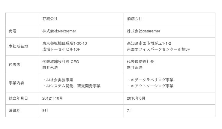 この度、株式会社Nextremer(本社:東京都板橋区、代表取締役社長 CEO:向井永浩、以下Nextremer)は、下記の通り2021年8月1日を効力発生日として当社100%出資の子会社である株式会社dataremer(本社:高知県南国市、以下dataremer)を吸収合併することを決定しましたので、お知らせいたします。さらに、本合併後はdataremer本社をNextremer高知本社と改称し、東京本社と合わせ二本社体制による業務を開始いたします。