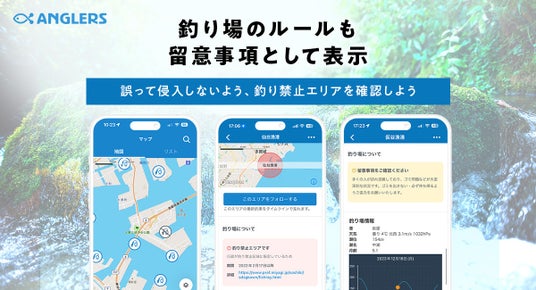 - 具体的な機能「ANGLERS」アプリ・WEBサイト上で、釣りができる場所と禁止エリアがひと目でわかるようになりました。マップ画面をタップすると、釣り禁止エリアの場合、禁止の理由や期間、さらには詳細情報へのリンクが表示されます。釣りができる場所でもその釣り場にルールがあれば、確認できます。
