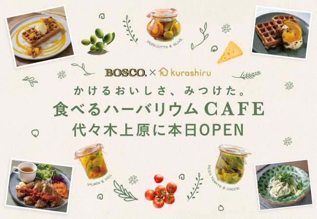 本カフェではBOSCOとクラシルがコラボし、野菜やチーズ、お肉などお好みの食材とハーブやスパイスなどを可愛い瓶に入れてオイル漬けする「食べるハーバリウム」をとおして、近年消費量が伸びているオリーブオイルの新しい楽しみ方をご提案します。