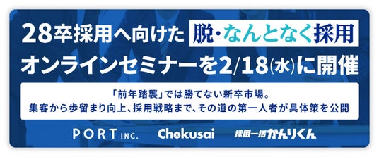 企業の採用活動を支援するHRクラウド株式会社(所在地:〒102-0094 東京都千代田区 代表取締役社長:中島悠揮 以下、当社)は、ポート株式会社(本社:東京都新宿区、代表取締役社長:春日博文)、株式会社これから(本社:東京都新宿区、代表取締役:今泉雄介)と共同で、2026年2月18日(水)に無料オンラインセミナー『【2/18(水)開催】28卒からの「脱・なんとなく採用」』を開催いたします。