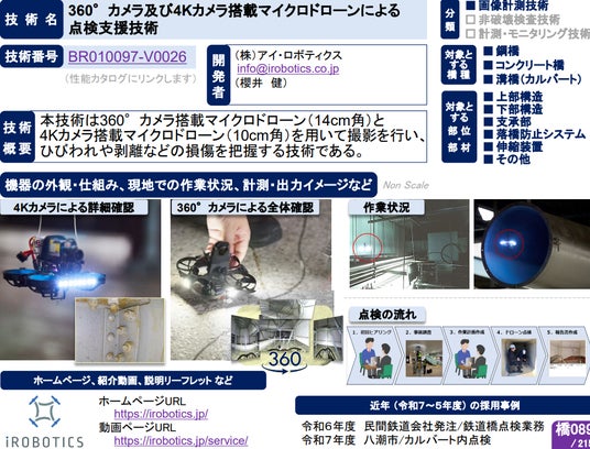 株式会社アイ・ロボティクス(本社:東京都千代田区、代表:安藤嘉康)は、当社が提供する「360°カメラ及び4Kカメラ搭載マイクロドローンによる点検支援技術」が、国土交通省の「点検支援技術性能カタログ(令和8年3月)」および「上下水道DX技術カタログ(令和8年3月)」に掲載されたことをお知らせいたします。