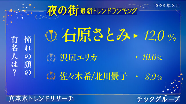 さらに名人の憧れランキングを調査。憧れの顔として堂々1位に輝いたのは2022年に第一子妊娠を発表した「石原さとみ」 (12.0%) 。さらには「沢尻エリカ」 (10.0%) 、「佐々木望」「北川景子」(10.0%)が同率でランクインしました。