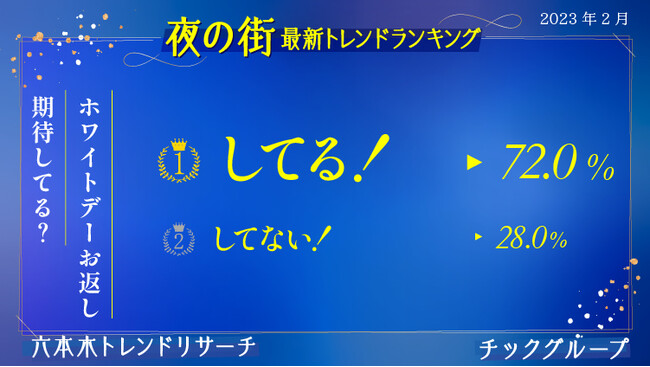 最後にホワイトデーに関しては72.0%がお返しを求めているという結果でしたので、六本木でチョコレートをもらった方はぜひ意識したほうがいいようです。