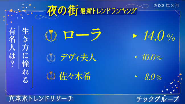 生き方に憧れる有名人にランクインしたのは「ローラ」(14.0%)が1位。さらに「デヴィ夫人」(10.0%)が2位に入りました。夢が「お嫁さん」の方々にはデヴィ夫人の生き方が参考になるのでしょうか。3位には「佐々木望」(8.0%)に入り、顔・生き方共にランクインしました。