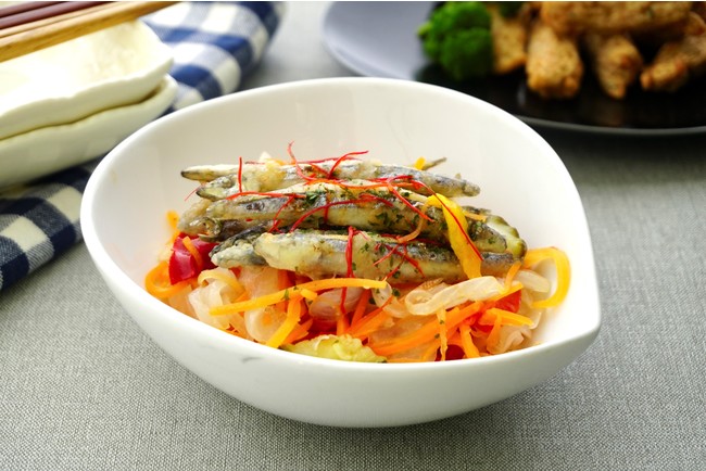 五島産のきびなごとよく合うように、レモンの酸味が効いたさっぱりとしたマリネ液を使用しています。赤・黄パプリカ、ズッキーニ、人参、玉ねぎといった色鮮やかな野菜と組み合わせています。野菜とは別にマリネしたきびなごをたっぷりトッピングし、満足感のある逸品に仕上げました。