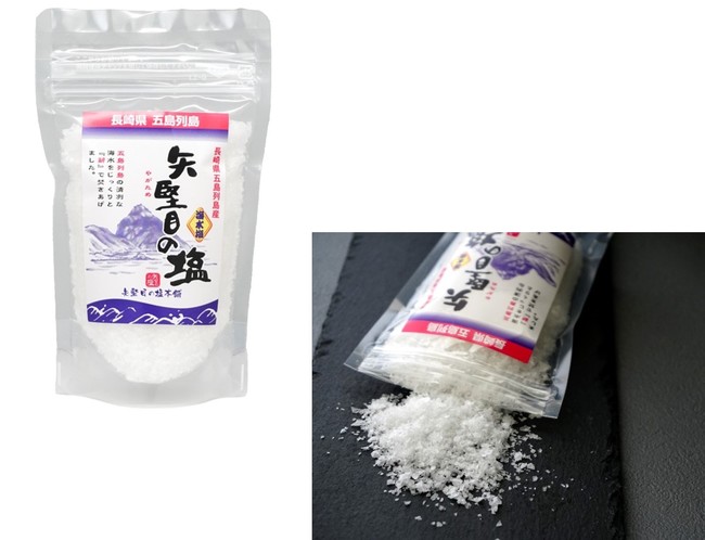 新上五島町に塩工房を構え、五島列島近海の海水塩だけで時間と手間をかけて精製した自然海水塩です。海水100%を原料に、五島列島の薪を使ってじっくりと焚く「平釜製法」という古代からの伝統方法で作られています。どんな料理にも合い、素材の旨みを引き出しより一層おいしくお召し上がりいただけます。食感は“シャクふわ”としており、キレの良い塩味が特長です。おにぎりはもちろんですが、お刺身にもよく合い、特に白身のお魚には相性抜群です。