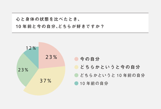 「心と身体の状態を比べたとき、10年前と今の自分、どちらが好きですか?」という質問に「今の自分」と回答した人は約23%と低い結果となりました。しかし、最も多い回答は「どちらかというと今の自分」が約37%となり、今の自分が好き、どちらかというと今の自分が好き、と思っている人が6割以上という結果でした。