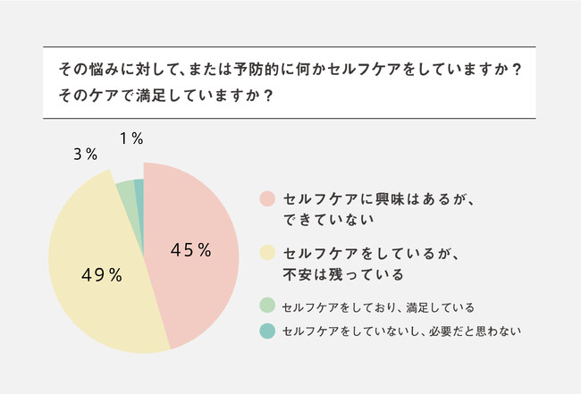 また、その悩みに対して(あるいは予防的に)、セルフケアを実施し満足しているのはわずか約4%となり、セルフケアを実施している女性の約93%が「不安が残っている」と回答しています。さらに、「セルフケアに興味はあるが、できていない」と回答した人が約46%と半数近くおり、多くの女性が心身の悩みに対して不安を感じていたり、解決方法がわからない状況にいることがわかりました。