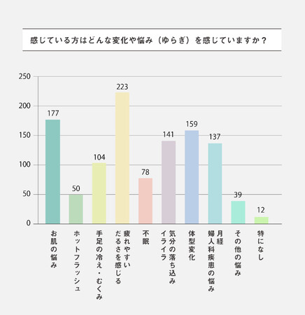 「心と身体に変化(ゆらぎ)が出ている」と回答した方は、「疲れやすい・だるさを感じる」や「気分の落ち込み・イライラ」という“心のゆらぎ”を感じている一方で、「お肌の悩み」や「体型の変化」、「月経や婦人科疾患の悩み」などの“身体のゆらぎ”も感じているようです。