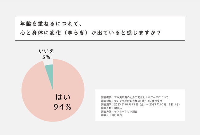 その結果、35~50歳の女性のうち約95%が「心と身体に変化(ゆらぎ)が出ている」と感じていることが分かりました。