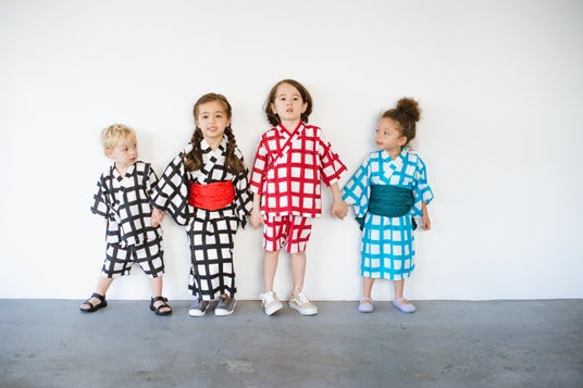 お揃いで着せられる 大きな格子柄の浴衣と甚平