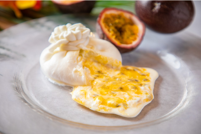 また、メディアでも多数取り上げられ、人気を博している「とろける旬果ブッラータ」シリーズから「とろけるパッションフルーツブッラータ」を店内でお楽しみいただけます。可愛らしい巾着型のブッラータチーズに南国の恵みパッションフルーツと自家製リリコイバターをとじこめた、NABUCCO自慢の一品です。