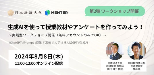 マンガ形式のDX人材育成サービス「MENTER」を提供するWHITE株式会社(本社: 神奈川県横浜市、代表取締役: 横山 隆)は、2024/08/08 (木)11:00 - 12:00にオンラインにて無料ウェビナー「生成AIを使って授業教材やアンケートを作ってみよう!」を開催することをお知らせいたします。