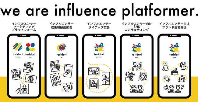 インフルエンサーの影響力を、世の中のあらゆる事業者に活用していただく世界を実現するべく、企業自らが直接インフルエンサーをキャスティングできるマーケティングプラットフォーム『toridori marketing/base』を中心とした、多彩なインフルエンス・プラットフォームサービスを展開しております。
