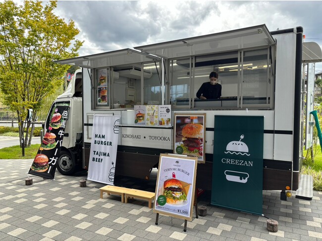 キッチンカーでは、兵庫県城崎温泉にある直営店 CREEZAN 城崎本店のカフェで人気No.1の「但馬牛ハンバーガー」やソフトドリンクを販売します。