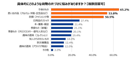 さらに、「悩みがある」と回答した人に対して、どのような荷物の収納に悩みがあるかを尋ねたところ、「子供のもの」と回答した人が65.2%と最も多く、以下、「思い出の物」(53.8%)、「衣類・ファッション・小物」(50.5%)となりました。子供のものはもちろんのこと、家族それぞれが所有する思い出の物や衣服などが核家族の片づけの主な悩みとなっています。