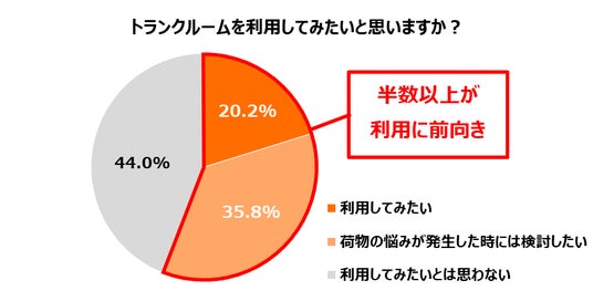 核家族500名全体にトランクルームを利用してみたいかを尋ねたところ、「利用してみたい」と回答した人は全体の約2割(20.2%)で、「荷物の悩みが発生した時には検討したい」と回答した人は35.8%でした。核家族の半数以上が利用に前向きであることが明らかになりました。