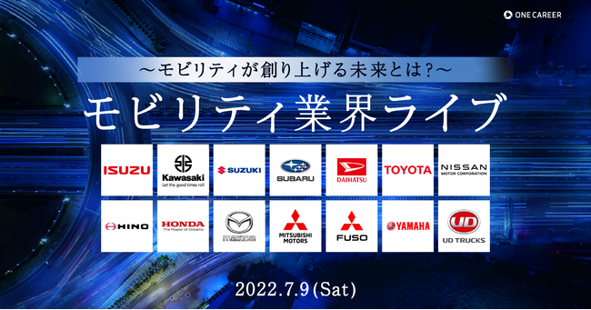 はじめてのキャリアを選ぶ、就活サイト「ONE CAREER」を運営する株式会社ワンキャリア(本社:東京都渋谷区、代表取締役社長 宮下尚之、以下ワンキャリア)は、2022年7月9日に、日本を代表する自動車メーカ−14社が出演するモビリティ業界ライブを開催いたします。