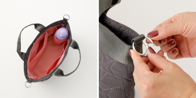 どんなファッションにも合わせやすいグレーカラーに、ポイントとなる星のステッチをキルティングの柄に取り入れました。バッグ内部の視認性を重視して、裏地のカラーは心ときめくピンクに。「キルティングストローラーバッグ」には4種のポケットを付け、サッと荷物を取り出せるようにしました。