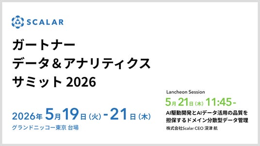 株式会社Scalar(本社:東京都、代表取締役CEO:深津航、代表取締役CTO:山田浩之、以下「Scalar」)は、2026年5月に開催される「ガートナー データ&アナリティクス サミット 2026」に出展し、展示ブースの出展およびランチョンセッションでの講演を実施いたします。