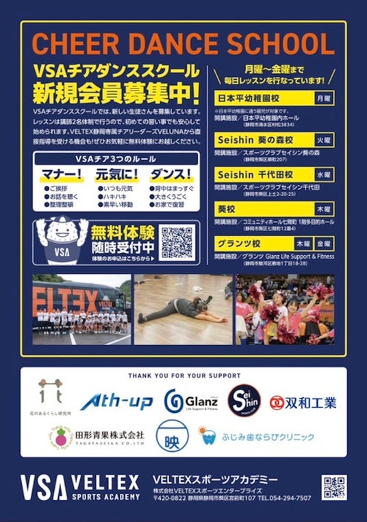 VSAチアダンススクールでは、ベルテックス静岡専属チアリーダーズ ベルーナのメンバーや、経験豊富なスクールコーチが在籍!