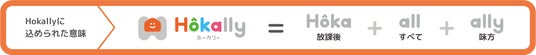 ロゴマークは「放課後(H)のお家」を表現しています。学童は子どもたちにとって“第二の家"のような、味方であり安心できる場所だと考えたことから、このデザインを採用しました。これには「放課後の第二のお家」の中でニコニコと笑う子どもたちを、Hokallyで支えていきたいという想いが込められています。