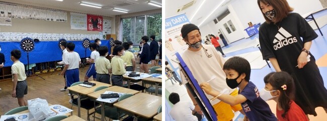 (左:小学校のクラブ活動への支援、右:親子で参加できるダーツ体験教室)