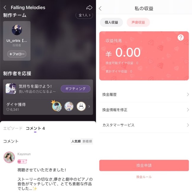 また、リスナーが作品へ有料ギフトを贈ることで、創作者は贈られたギフト分の収益を受け取ることができます。これにより、創作者の創作活動を気持ちと経済、両方の面から応援できます。