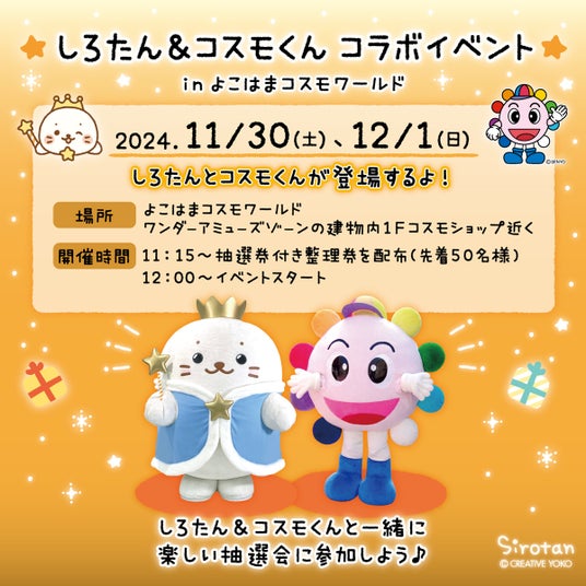 また、プロジェクションマッピングと連動し、ワンダーアミューズ・ゾーンの建物内1Fコスモショップ近くにて、キューブ型やフィルム型のLEDディスプレイを設置し、『しろたん』の映像を投影します。「よこはまコスモワールド」のキャラクター『コスモ君』とのコラボイベントも開催予定です。