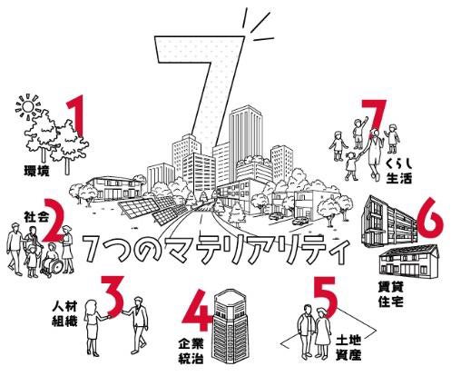 社会の変化を成長の機会と捉え、特に注力すべき重要課題を「大東建託グループ 7つのマテリアリティ」に定め、グループ全体でサステナビリティ経営を推進しています。