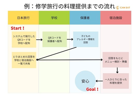 そこで、宿泊施設をはじめとする外食のアレルギー対応をサポートしてきたCAN EATは、日本初の旅行会社として数多くの修学旅行を作り上げ、子どもたちの思い出づくりをサポートしてきた日本旅行と提携し、日本旅行の全拠点に当社のアレルギー対応ITシステム「アレルギーヒアリングシステム(https://biz.caneat.jp/allergyhearing/)」を採用することを決定しました。